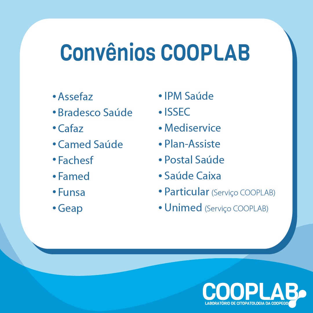 25 de janeiro de 2022 Convênios COOPLAB facebook whatsapp linkedin google+ twitter O Laboratório de Citopatologia da COOPEGO disponibiliza uma ampla rede de convênios com o objetivo de oferecer sempre o melhor para nossos cooperados. 🔬Abaixo confira os convênios.Esperamos por você! 💚