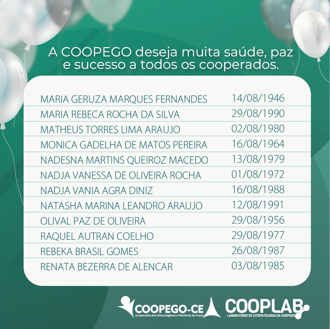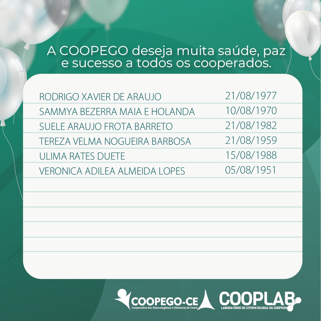 31 de julho de 2023 Cooperados Aniversariantes do Mês de Agosto facebook whatsapp linkedin google+ twitter A Coopego deseja muita saúde, paz e sucesso para todos os nossos Cooperados que fazem aniversário no mês de Agosto!