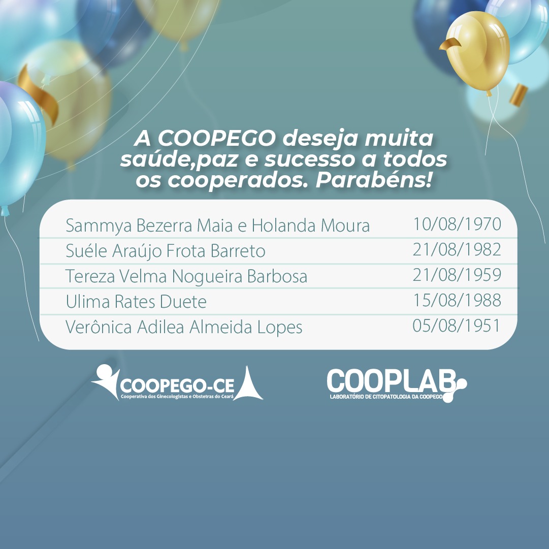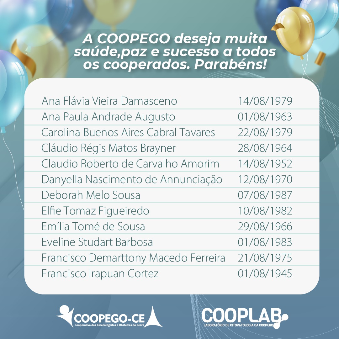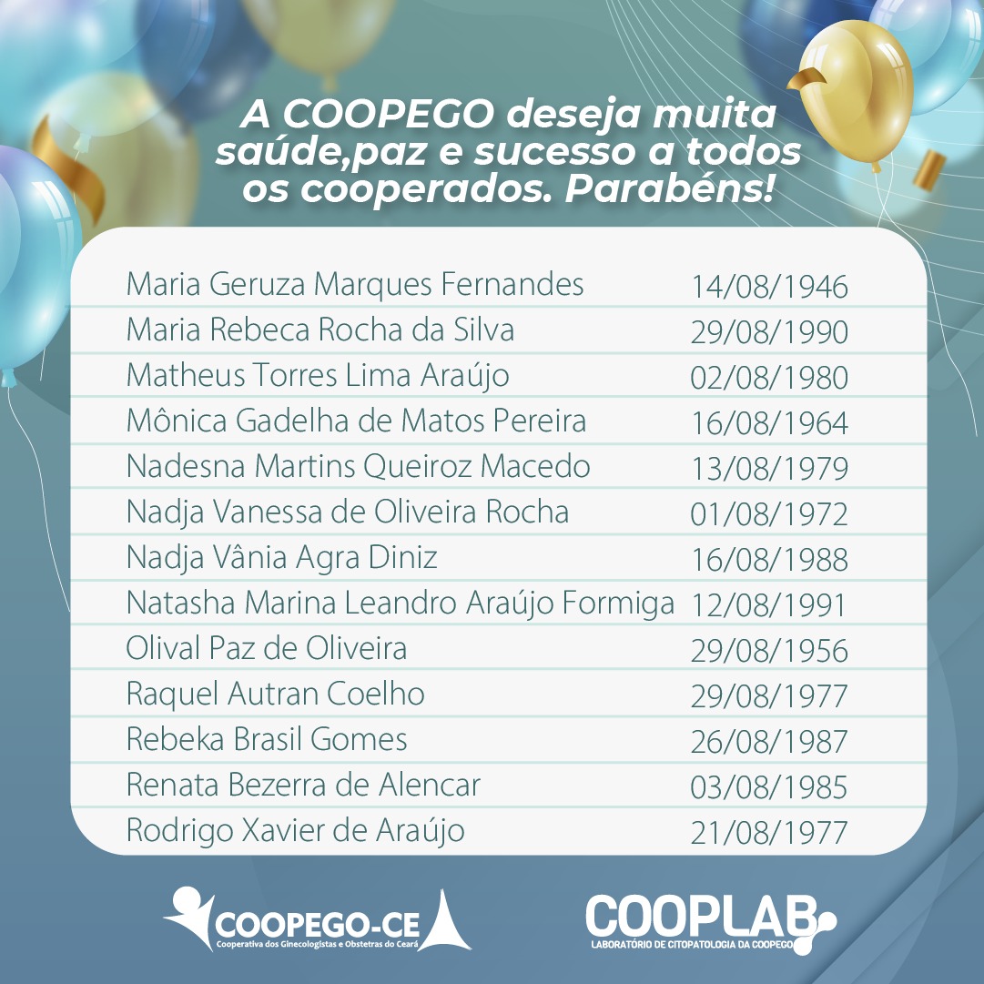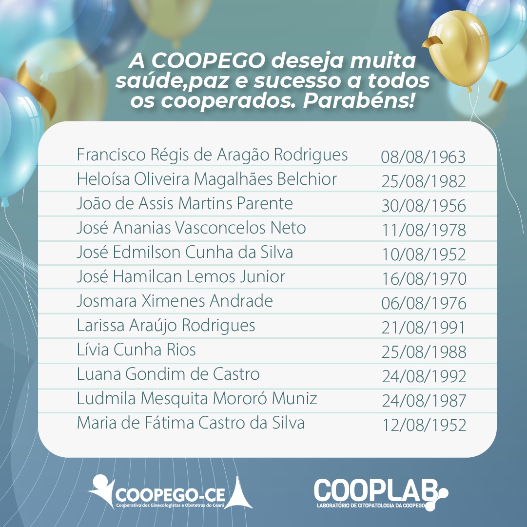 28 de julho de 2022 Cooperados Aniversariantes do Mês de Agosto facebook whatsapp linkedin google+ twitter A Coopego deseja muita saúde, paz e sucesso para todos os nossos Cooperados que fazem aniversário no mês de Agosto!