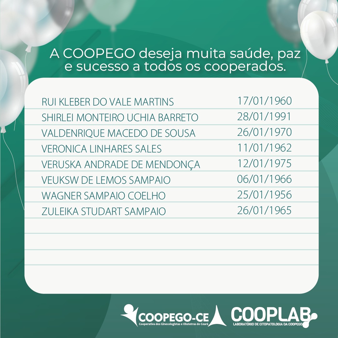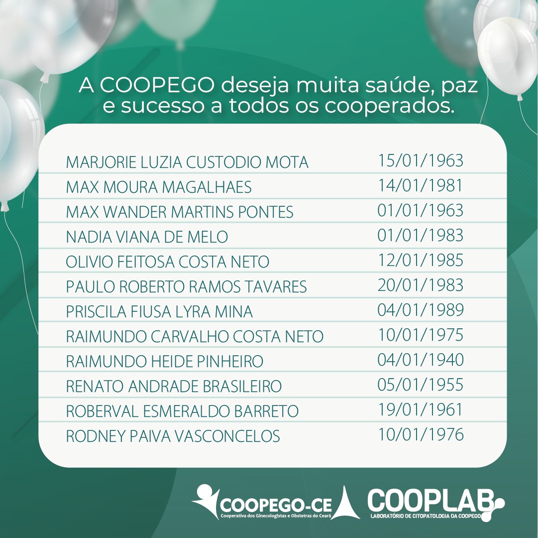 3 de janeiro de 2024 Cooperados Aniversariantes do Mês de Janeiro facebook whatsapp linkedin google+ twitter A Coopego deseja muita saúde, paz e sucesso para todos os nossos Cooperados que fazem aniversário no mês de Janeiro.