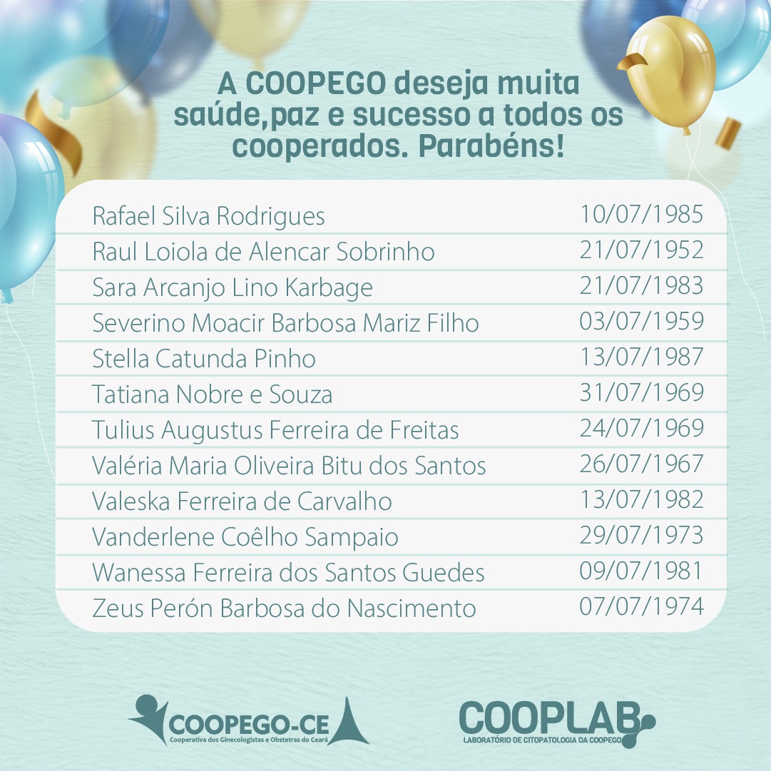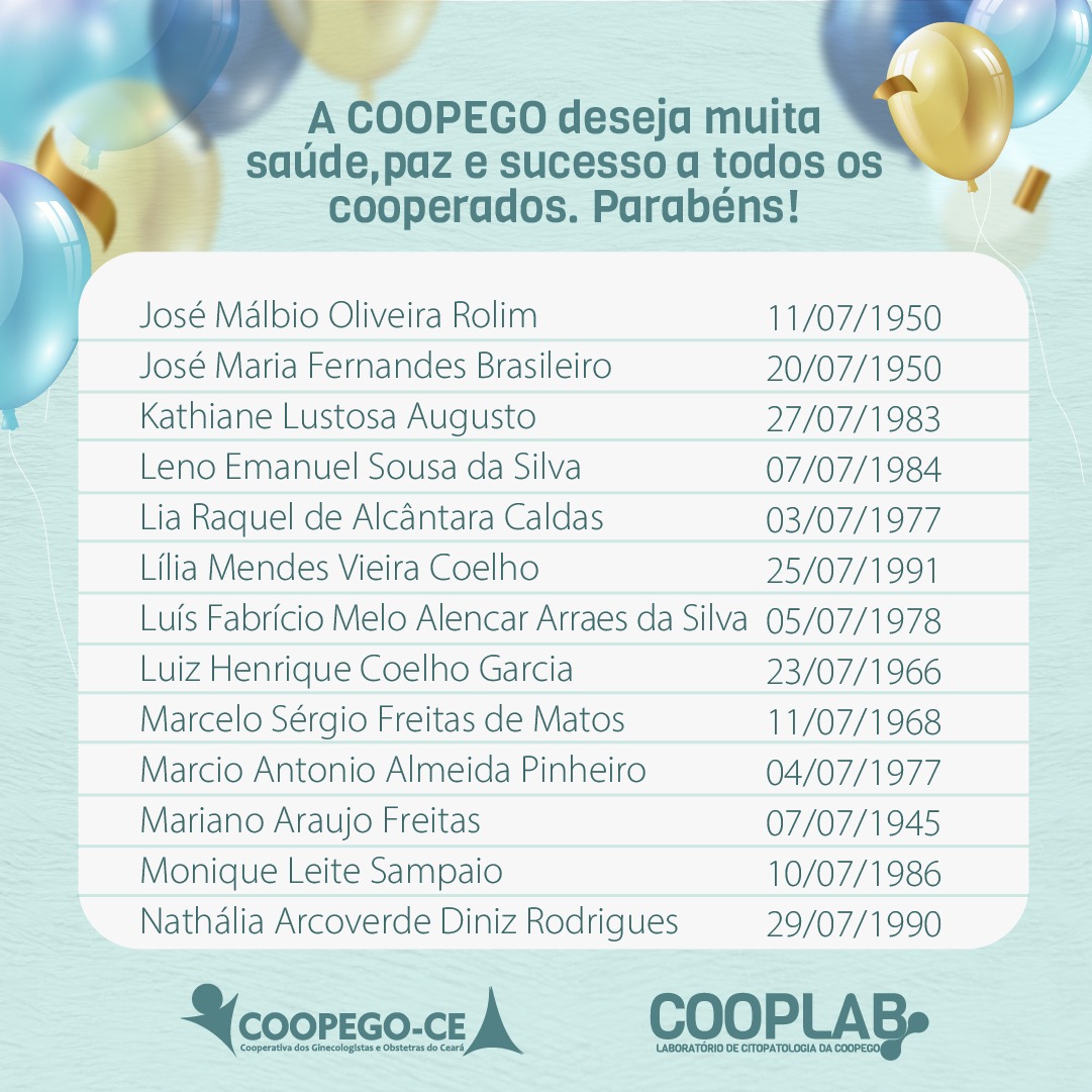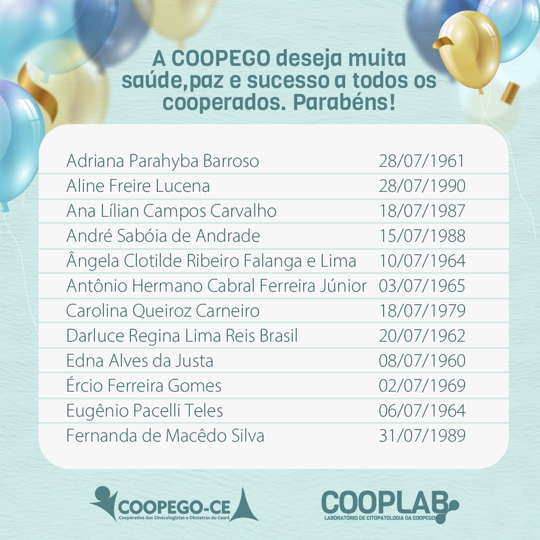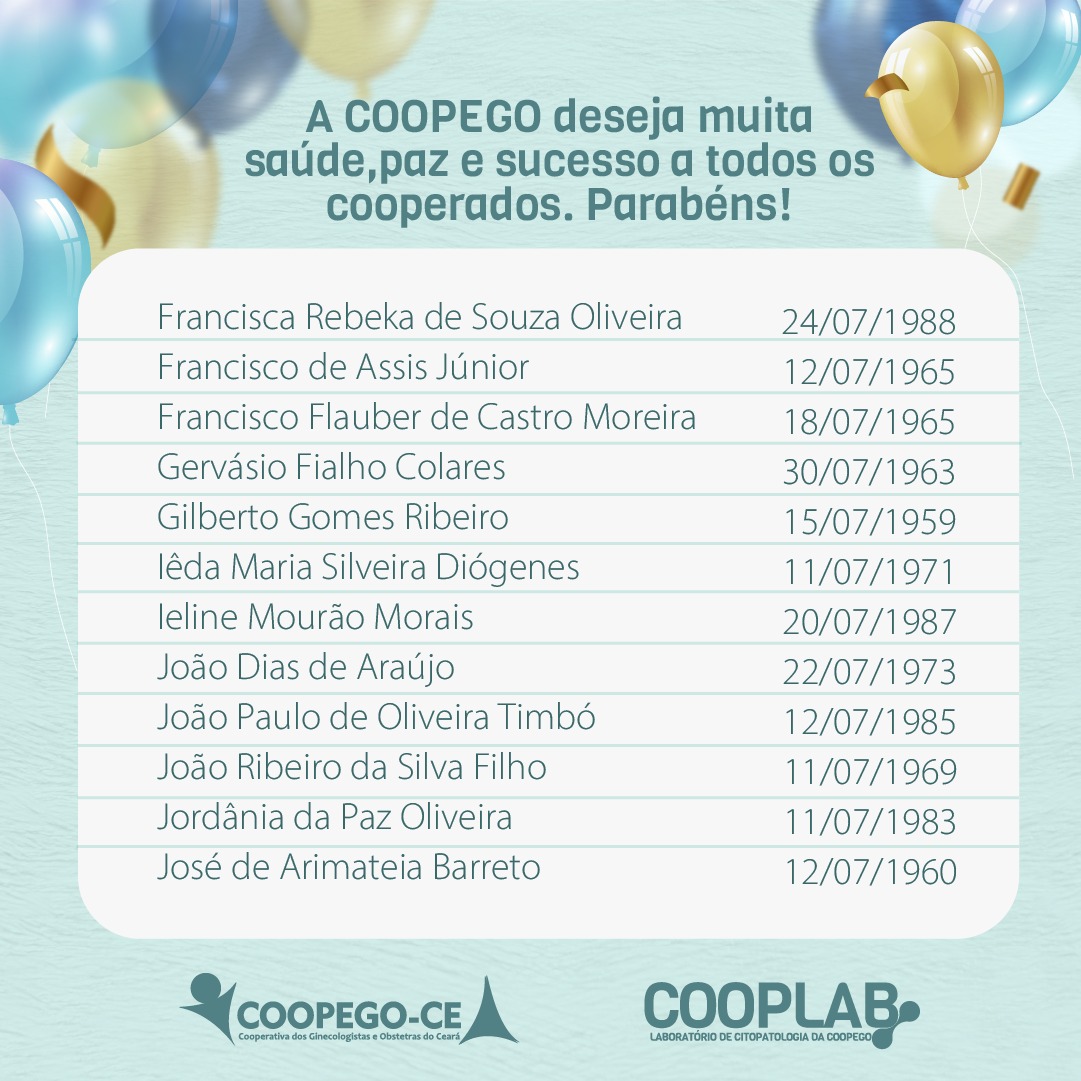 30 de junho de 2022 Cooperados aniversariantes do mês de Julho! facebook whatsapp linkedin google+ twitter A Coopego deseja muita saúde, paz e sucesso para todos os nossos Cooperados que fazem aniversário no mês de Julho!