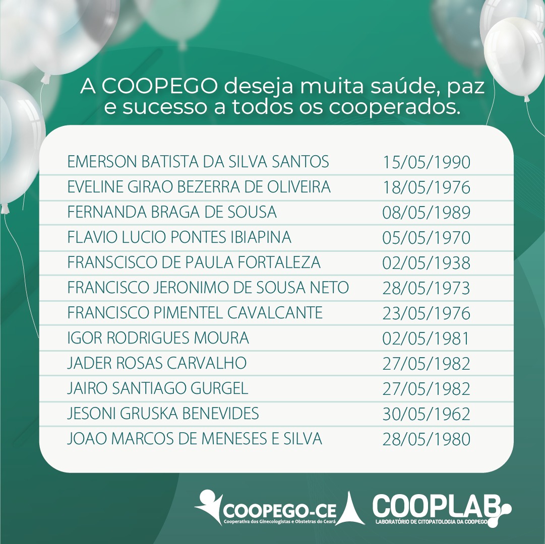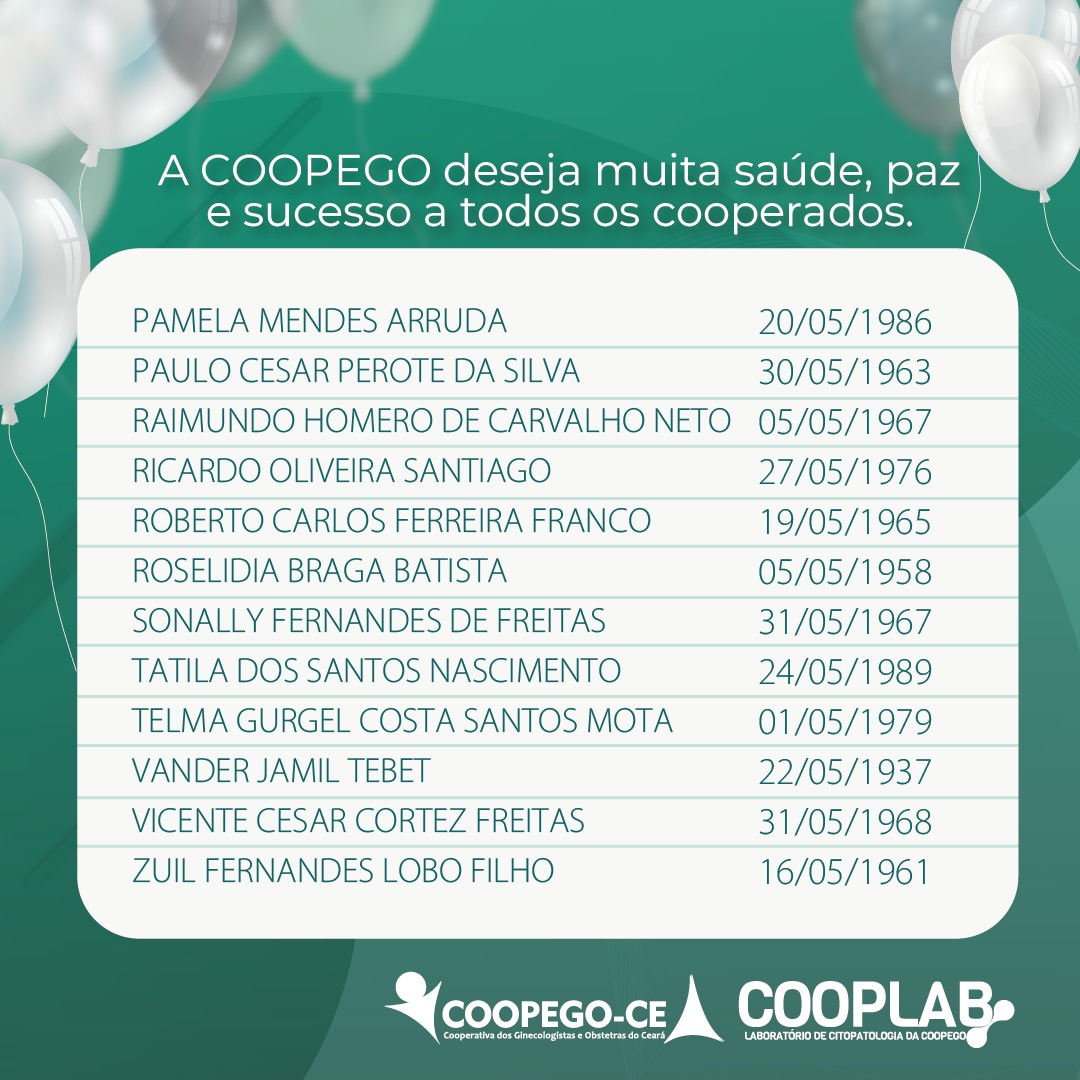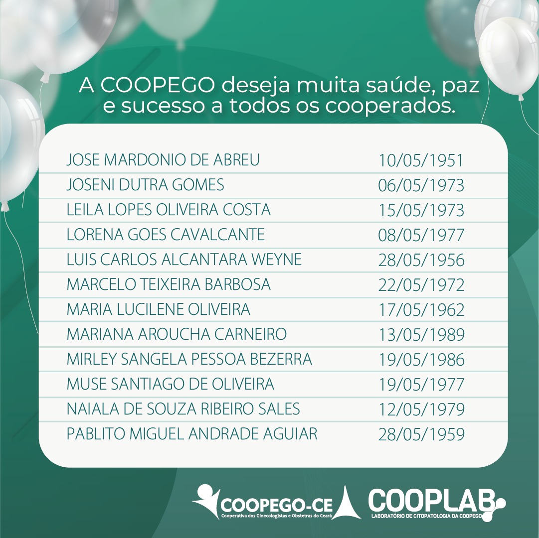 28 de abril de 2023 Cooperados Aniversariantes do Mês de Maio facebook whatsapp linkedin google+ twitter A Coopego deseja muita saúde, paz e sucesso para todos os nossos Cooperados que fazem aniversário no mês de Maio!