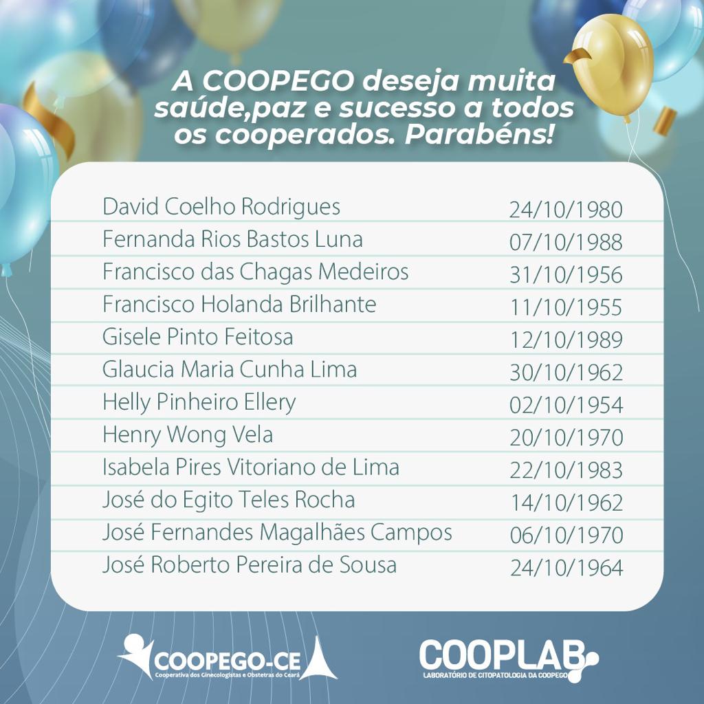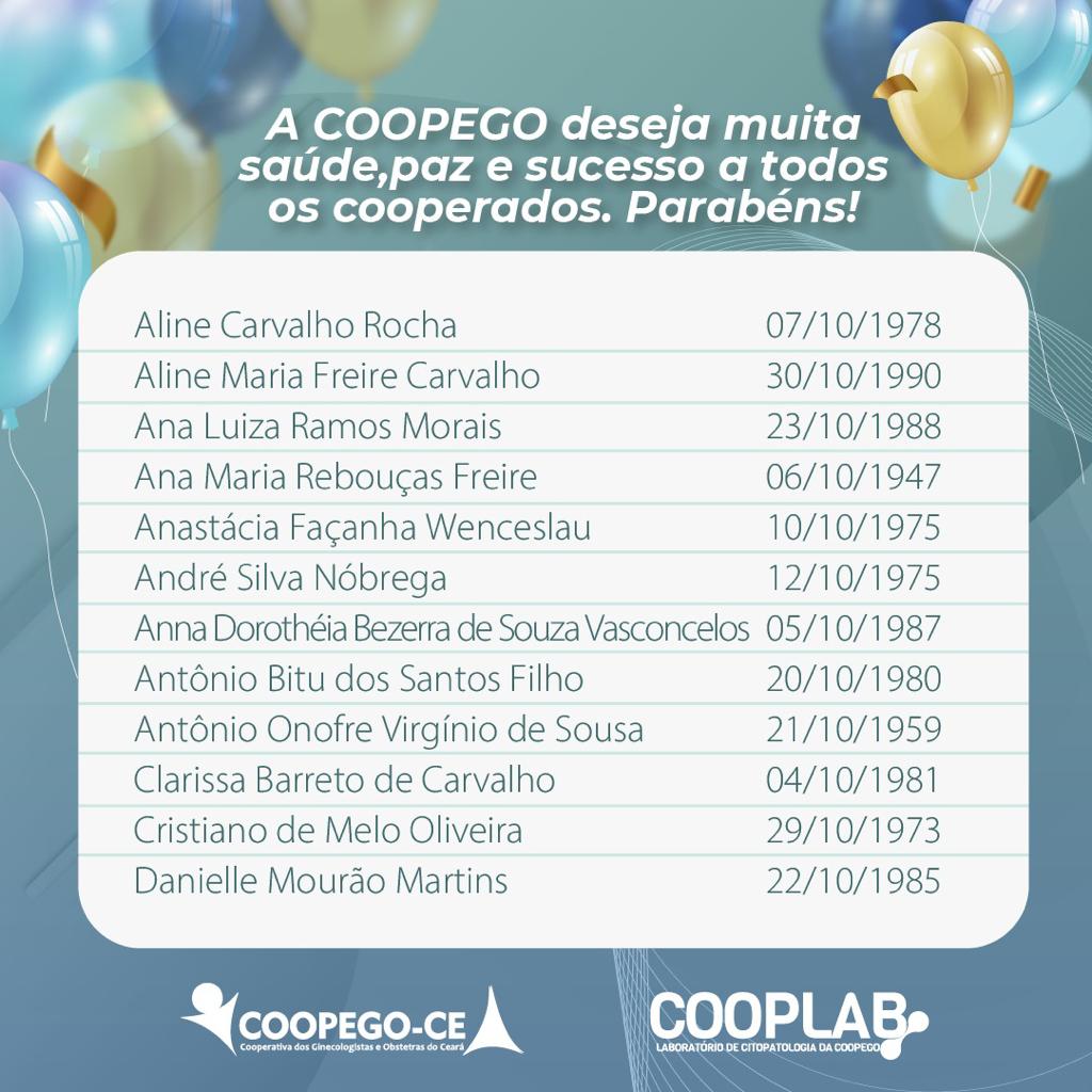30 de setembro de 2022 Cooperados Aniversariantes do Mês de Outubro facebook whatsapp linkedin google+ twitter A Coopego deseja muita saúde, paz e sucesso para todos os nossos Cooperados que fazem aniversário no mês de Outubro!