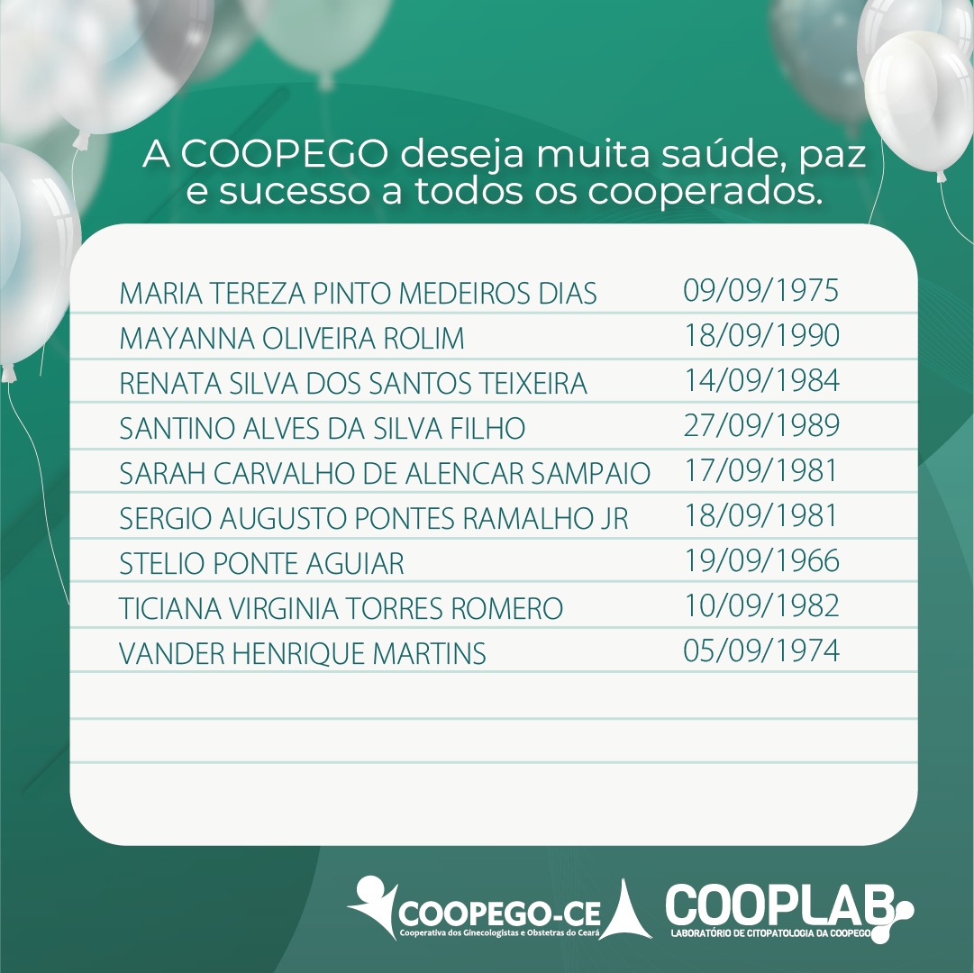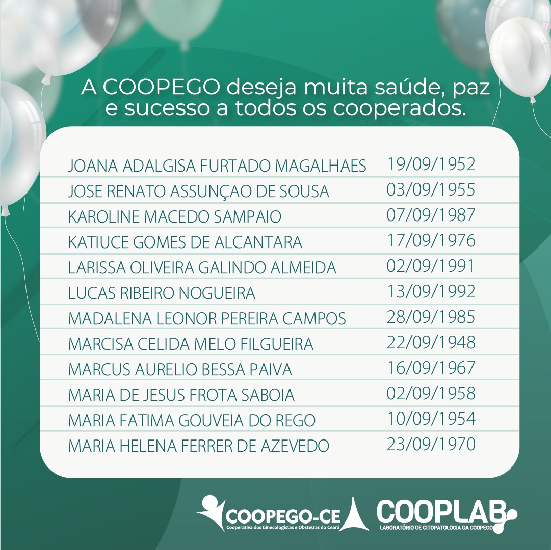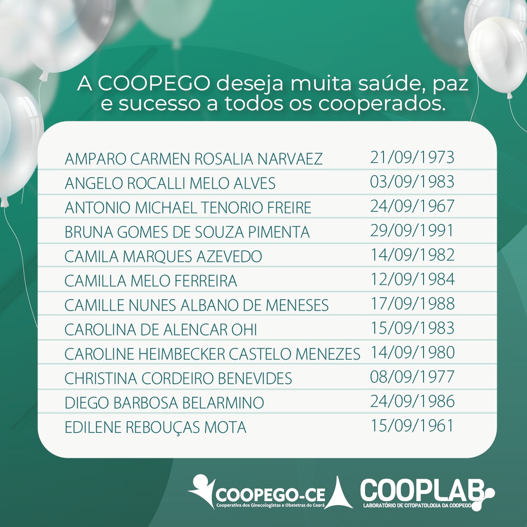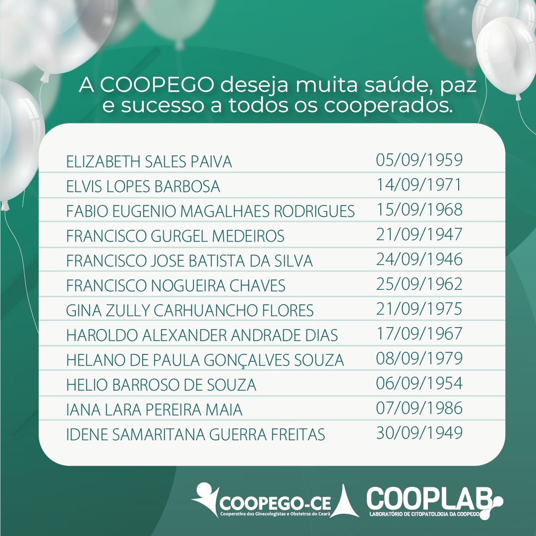 31 de agosto de 2023 Cooperados Aniversariantes do Mês de Setembro facebook whatsapp linkedin google+ twitter A Coopego deseja muita saúde, paz e sucesso para todos os nossos Cooperados que fazem aniversário no mês de Setembro!