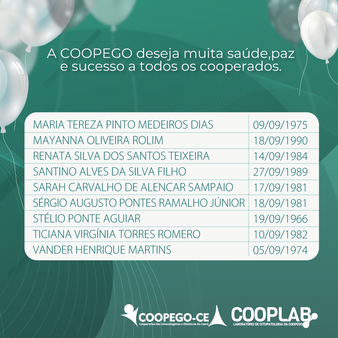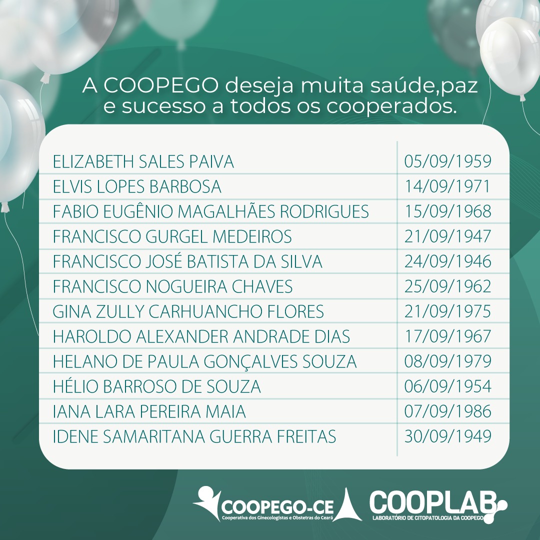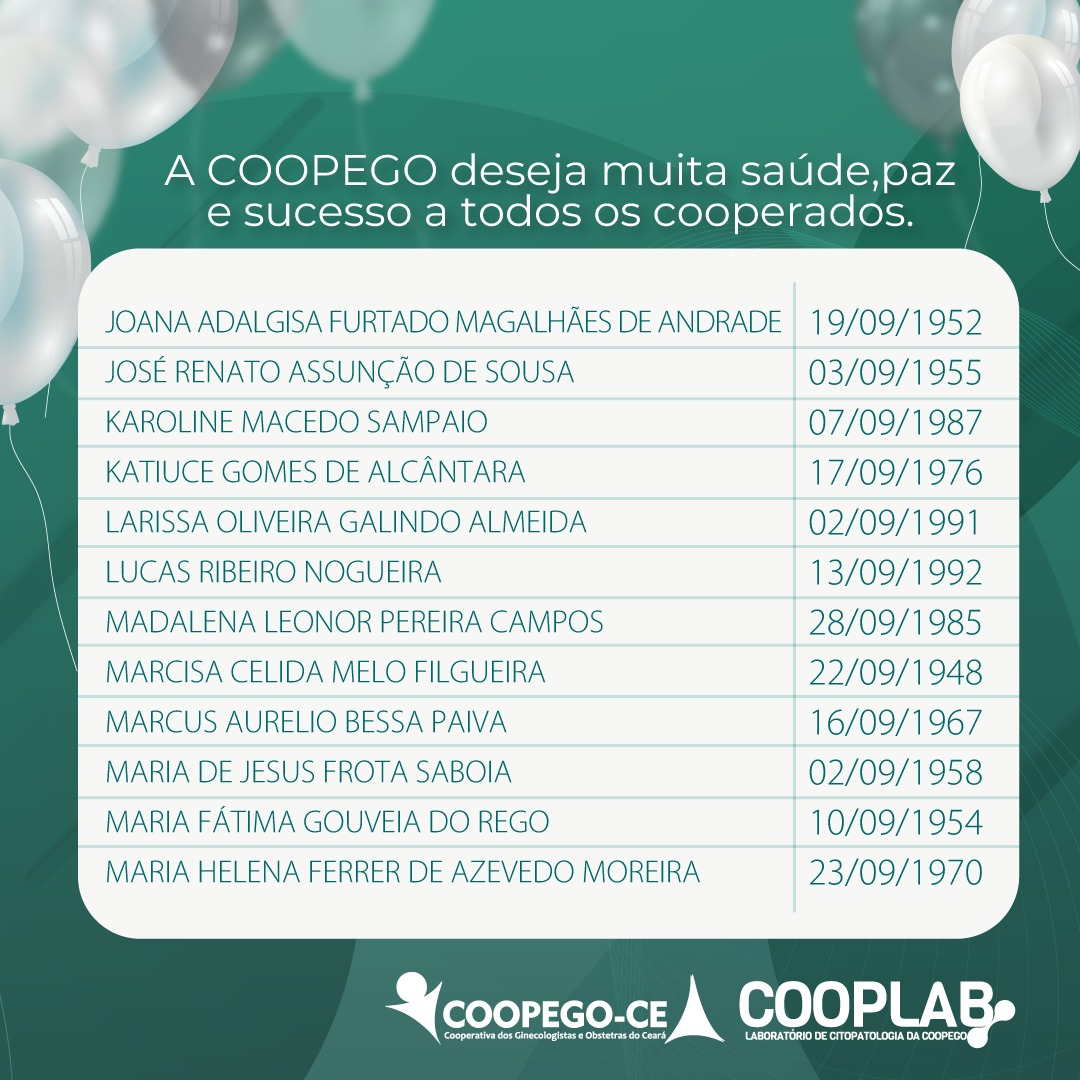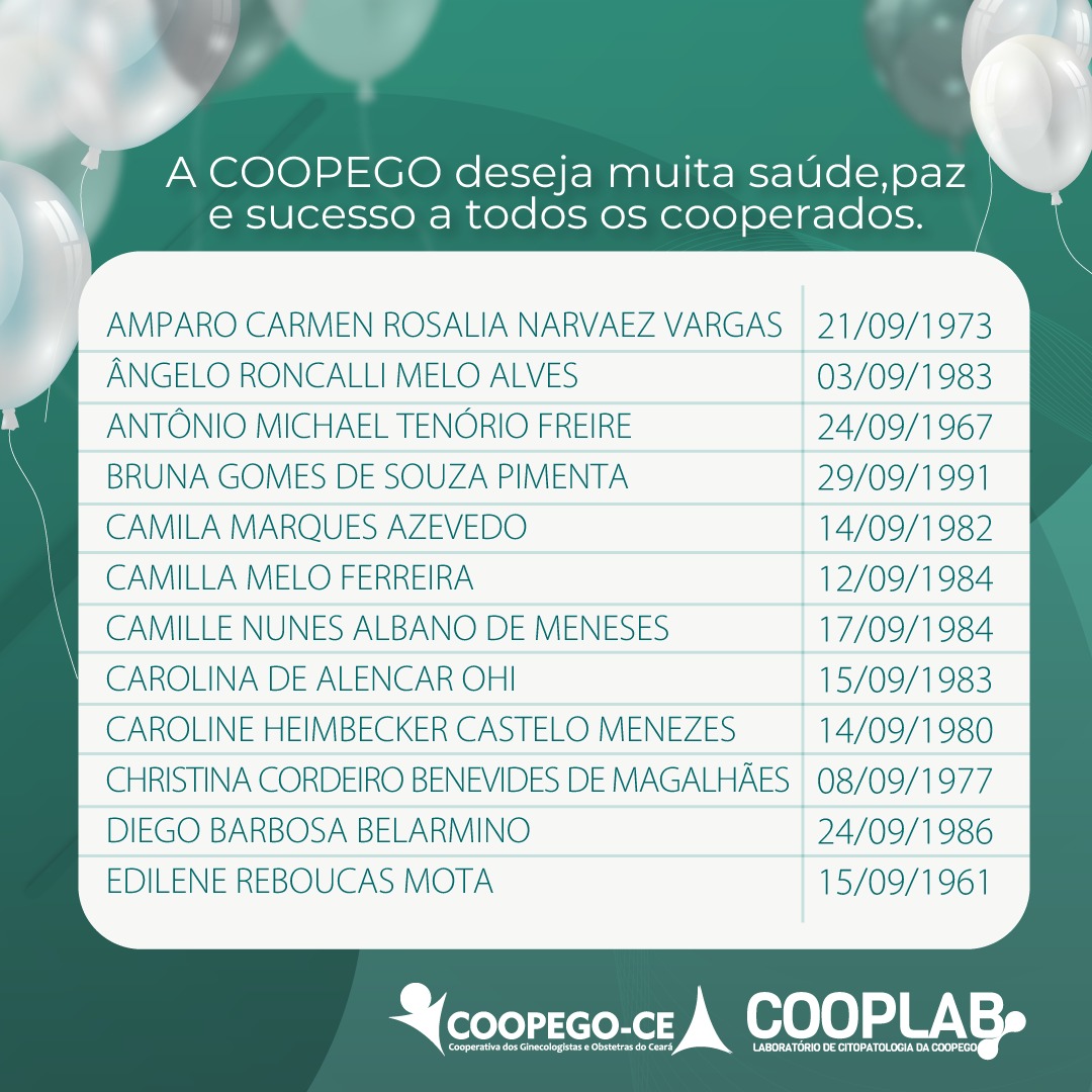 3 de setembro de 2024 Cooperados Aniversariantes do Mês de Setembro facebook whatsapp linkedin google+ twitter A Coopego deseja muita saúde, paz e sucesso para todos os nossos Cooperados que fazem aniversário no mês de Setembro: