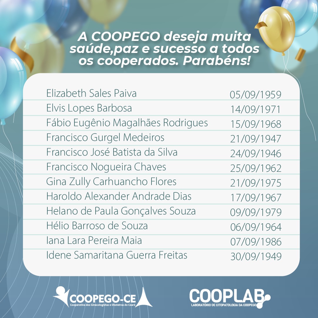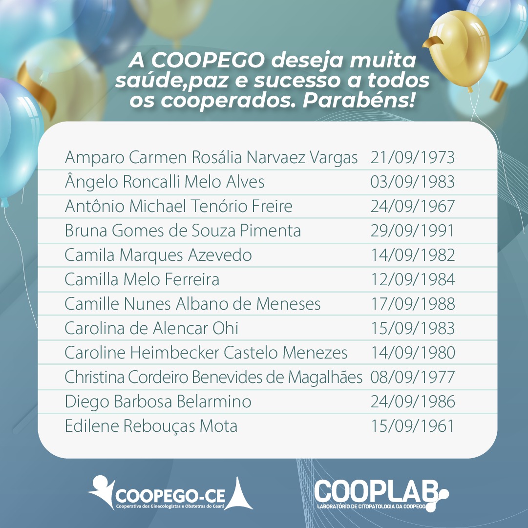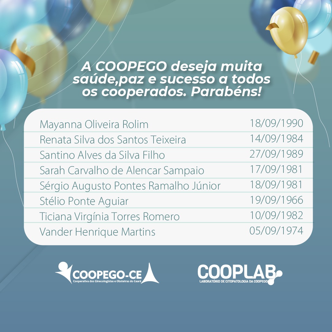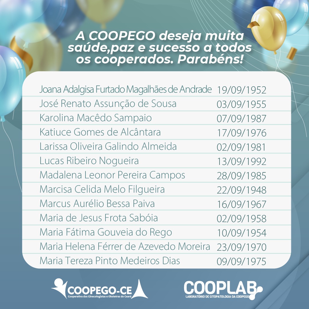31 de agosto de 2022 Cooperados aniversariantes do mês de Setembro facebook whatsapp linkedin google+ twitter A Coopego deseja muita saúde, paz e sucesso para todos os nossos Cooperados que fazem aniversário no mês de Setembro!