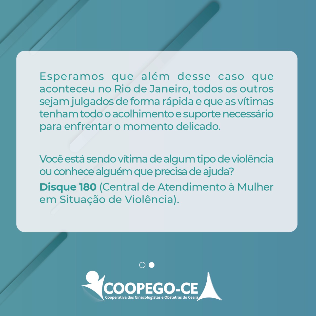 Em virtude do acontecido no Rio de Janeiro, nós da Coopego (Cooperativa dos Ginecologistas e Obstetras do Ceará), manifestamos total repúdio ao caso do anestesiologista que praticou estupro à uma paciente após dar à luz.