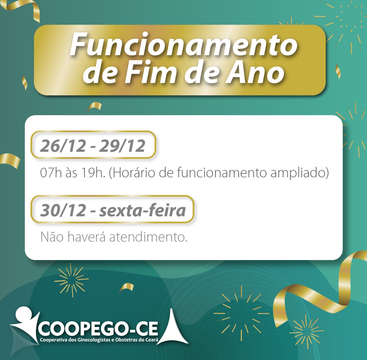 📢 Atenção cooperados (as), A COOPEGO funcionará com horário estendido de 07h às 19h, segunda …