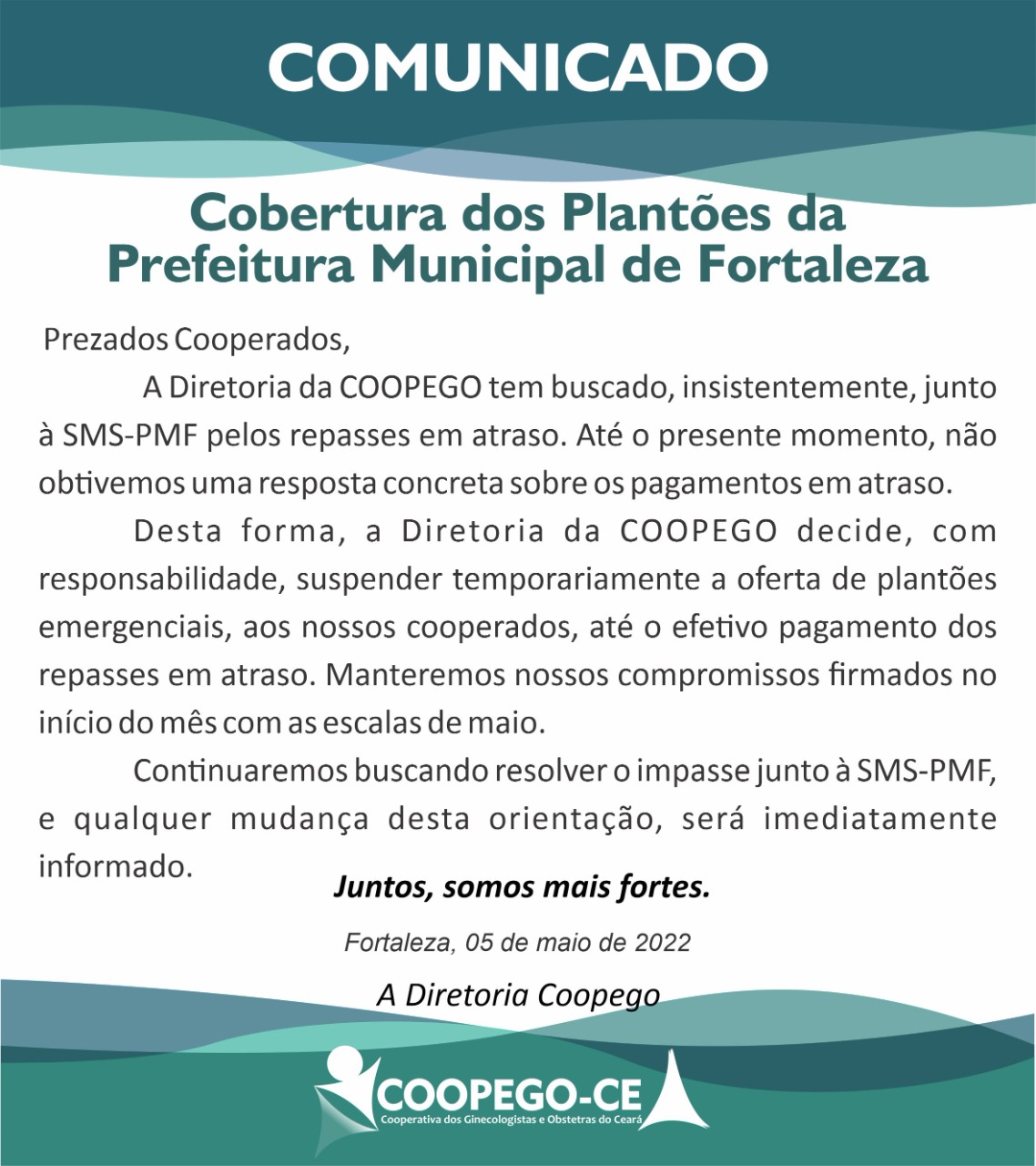 Prezados Cooperados, A Diretoria da COOPEGO tem buscado, insistentemente, junto à SMS-PMF pelos repasses em …