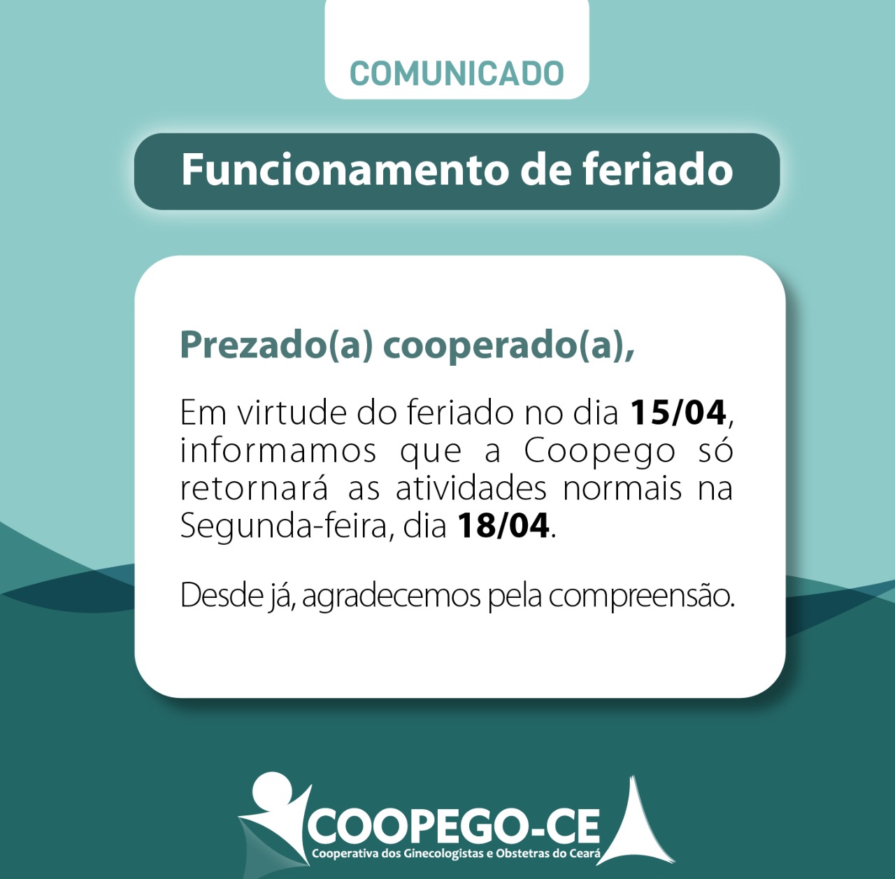 📢 Atenção cooperados(as), A COOPEGO não funcionará dia 15/04 (sexta-feira), devido ao feriado da Semana …