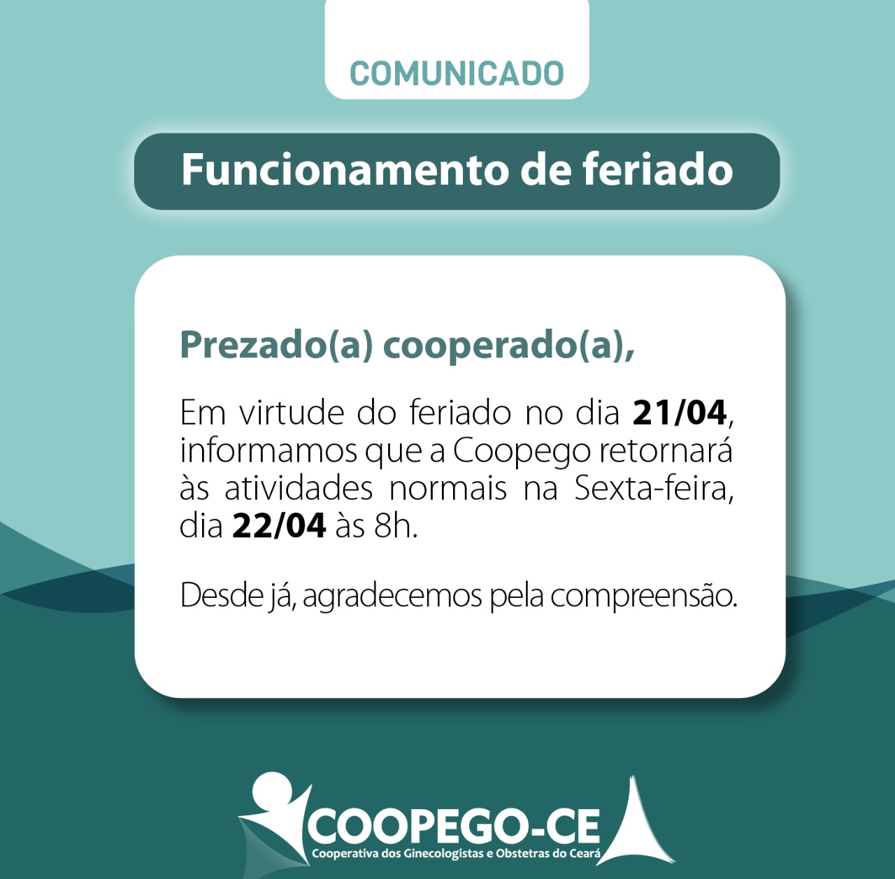 📢 Atenção cooperados (as), A COOPEGO não funcionará dia 21/04 (quinta-feira), devido ao feriado do …